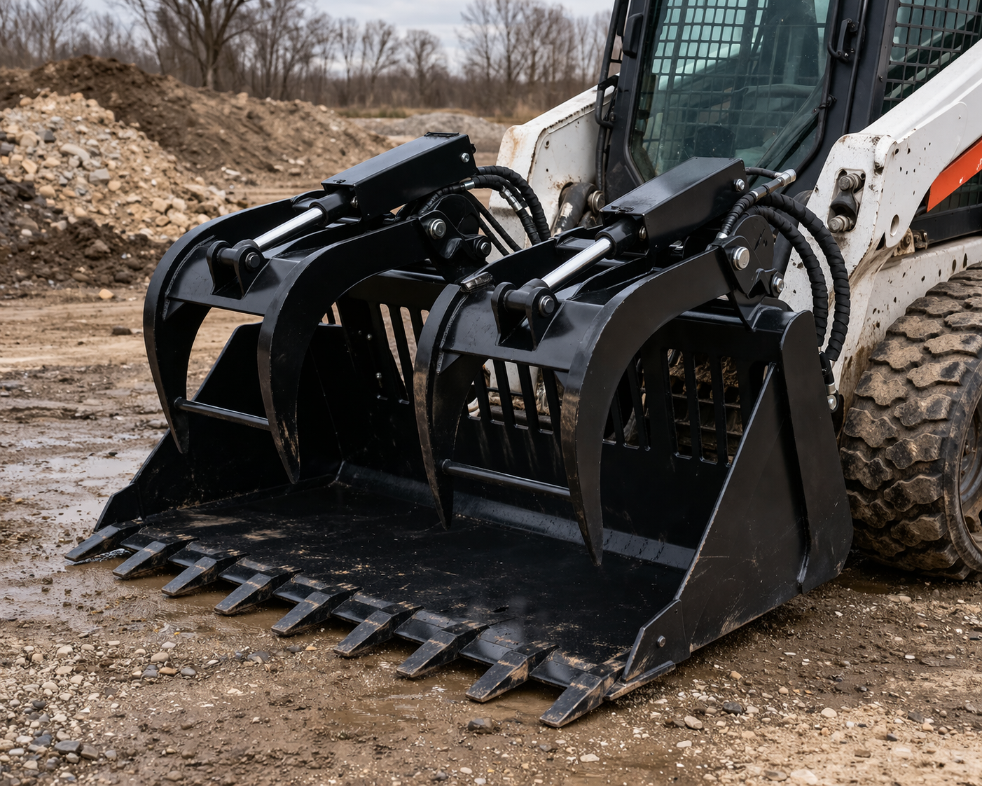 The equipment lifts logs, root balls, brush piles, stumps, and other bulky debris that cannot be moved by hand or with a standard bucket loader.